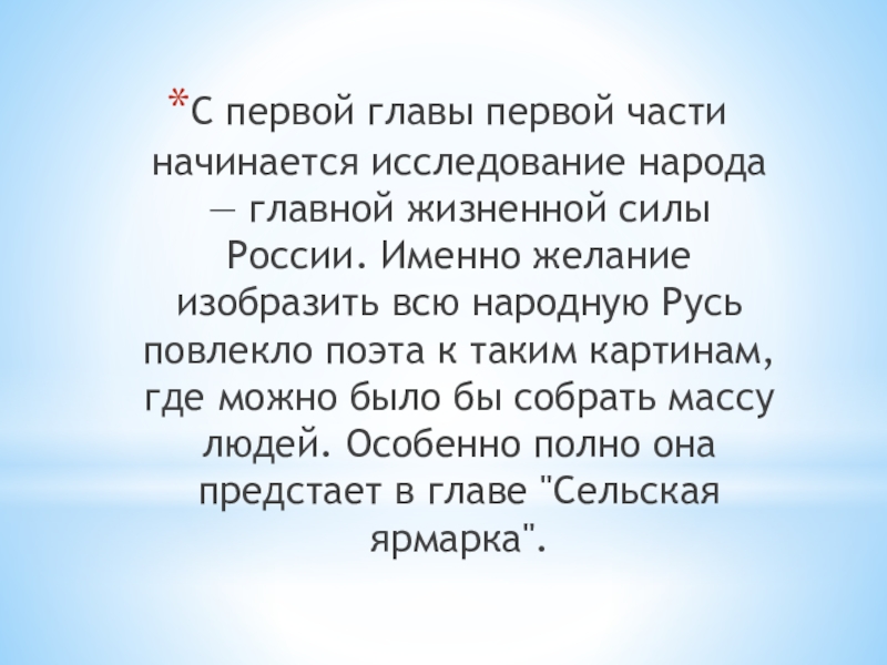 силы России. Именно желание изобразить всю народную Русь повлекло поэта к таким картинам, где можно было бы собрать массу людей. Особенно полно она предстает в главе "Сельская ярмарка".