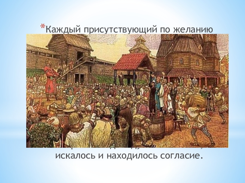 точку зрения. Вместо голосования действовал принцип общего согласия. В ходе обсуждения вызревал "мирской приговор" и недовольные переубеждались или отступали. Если общего согласия не получалось, сходка переносилась на следующий день. В ходе жарких споров постепенно вызревало единодушное мнение, искалось и находилось согласие.