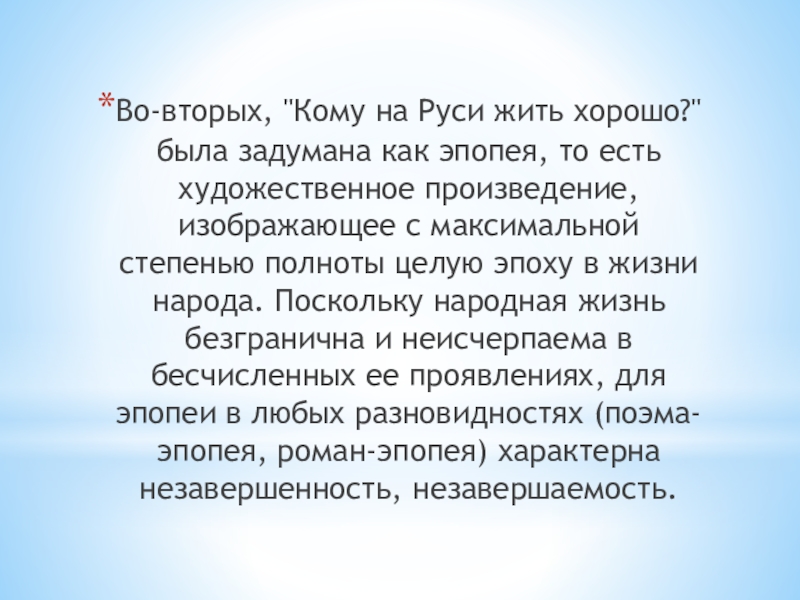 Слайд 9Во-вторых, "Кому на Руси жить хорошо?" была задумана как эпопея, то