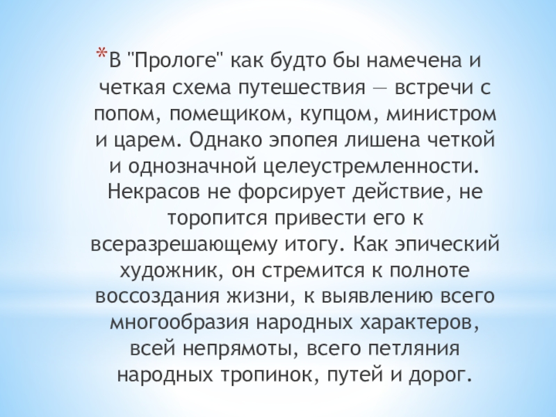 встречи с попом, помещиком, купцом, министром и царем. Однако эпопея лишена четкой и однозначной целеустремленности. Некрасов не форсирует действие, не торопится привести его к всеразрешающему итогу. Как эпический художник, он стремится к полноте воссоздания жизни, к выявлению всего многообразия народных характеров, всей непрямоты, всего петляния народных тропинок, путей и дорог.
