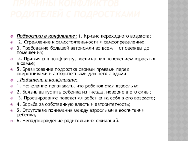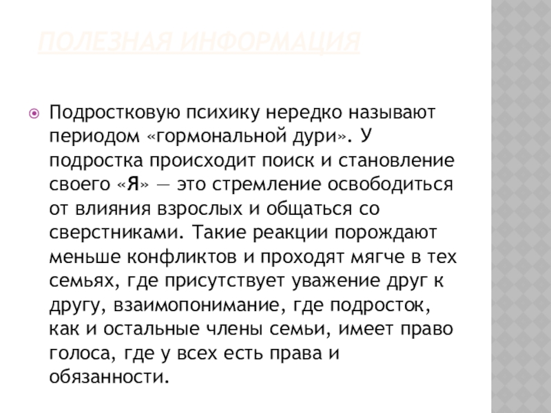 подростка происходит поиск и становление своего «Я» — это стремление освободиться от влияния взрослых и общаться со сверстниками. Такие реакции порождают меньше конфликтов и проходят мягче в тех семьях, где присутствует уважение друг к другу, взаимопонимание, где подросток, как и остальные члены семьи, имеет право голоса, где у всех есть права и обязанности.