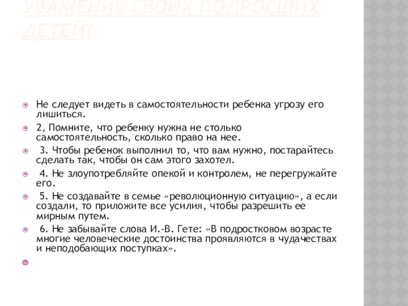6. Не забывайте слова И.-В. Гете: «В подростковом возрасте многие человеческие достоинства проявляются в чудачествах и неподобающих поступках».