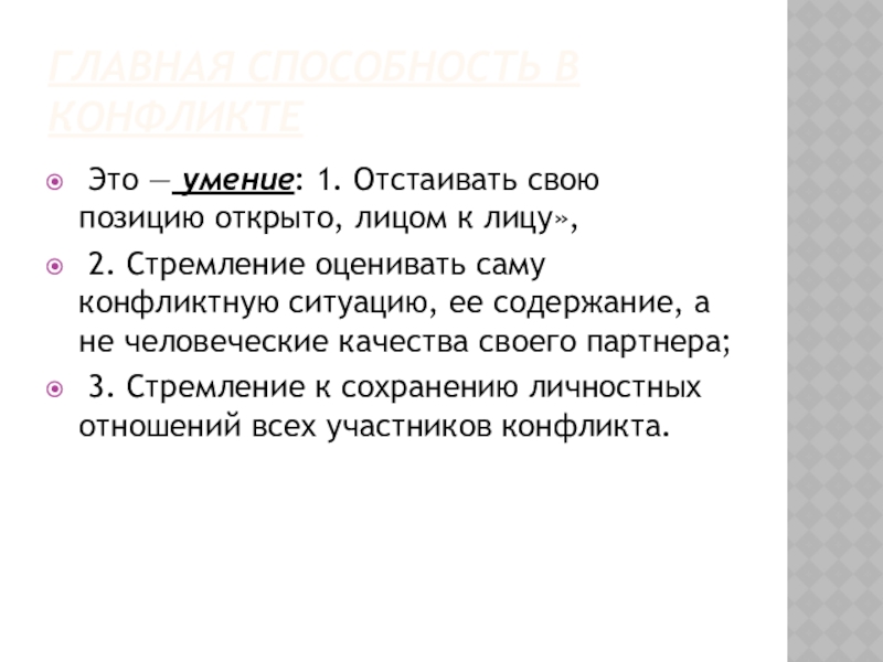 2. Стремление оценивать саму конфликтную ситуацию, ее содержание, а не человеческие качества своего партнера;