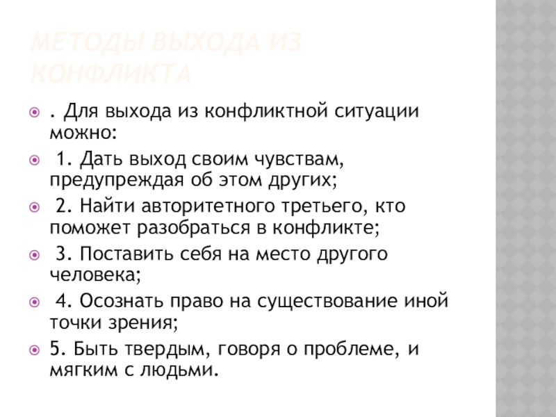 4. Соблюдайте этику поведения в конфликтной ситуации, решайте проблему, а не сводите счеты. 5. Будьте тверды и открыты, если убеждены в своей правоте.