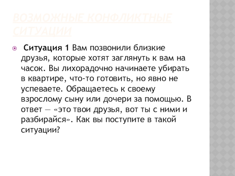 заглянуть к вам на часок. Вы лихорадочно начинаете убирать в квартире, что-то готовить, но явно не успеваете. Обращаетесь к своему взрослому сыну или дочери за помощью. В ответ — «это твои друзья, вот ты с ними и разбирайся». Как вы поступите в такой ситуации?