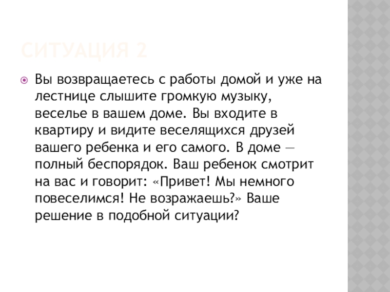 громкую музыку, веселье в вашем доме. Вы входите в квартиру и видите веселящихся друзей вашего ребенка и его самого. В доме — полный беспорядок. Ваш ребенок смотрит на вас и говорит: «Привет! Мы немного повеселимся! Не возражаешь?» Ваше решение в подобной ситуации?