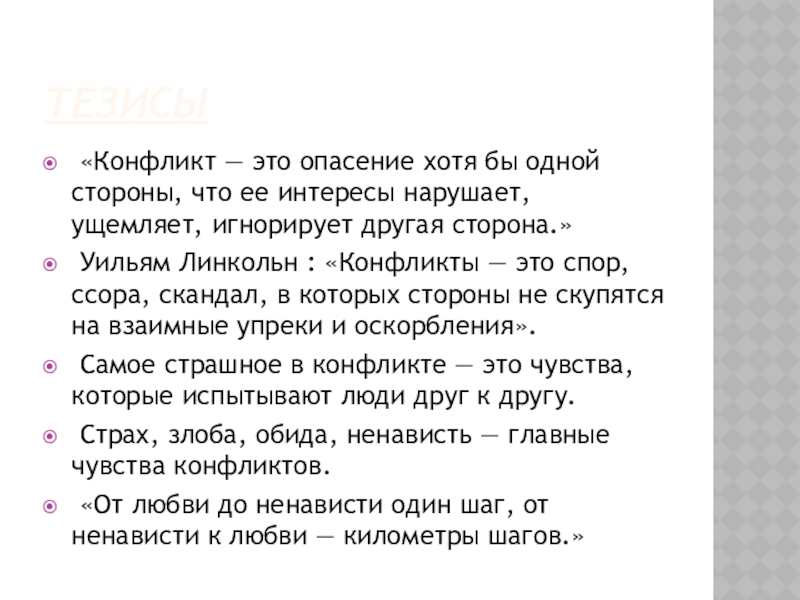 Уильям Линкольн : «Конфликты — это спор, ссора, скандал, в которых стороны не скупятся на взаимные упреки и оскорбления».