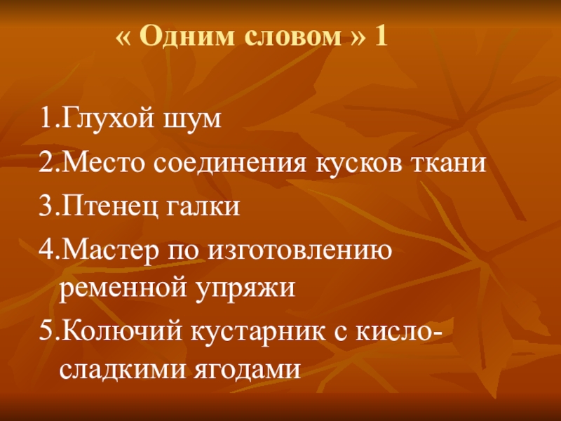 « Одним словом » 11.Глухой шум 2.Место соединения кусков ткани 3.Птенец галки 4.Мастер по изготовлению ременной упряжи