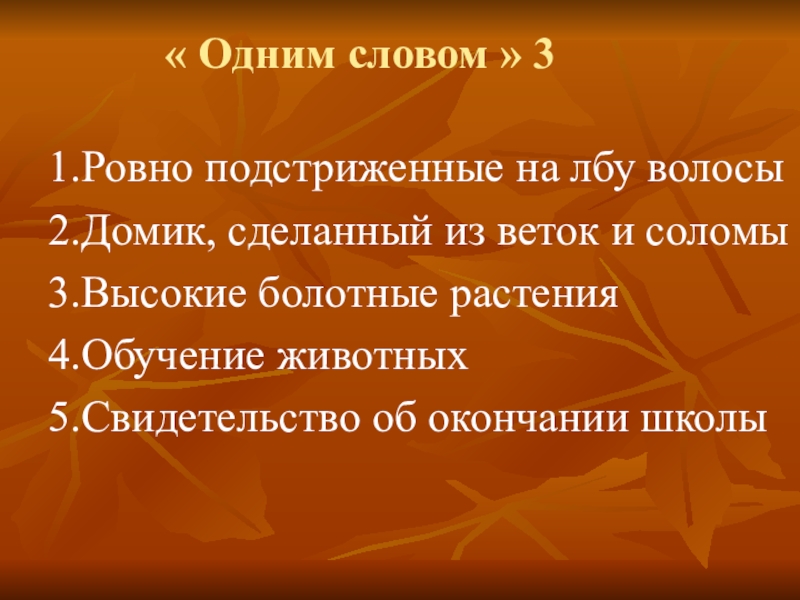 « Одним словом » 31.Ровно подстриженные на лбу волосы 2.Домик, сделанный из веток и соломы 3.Высокие болотные