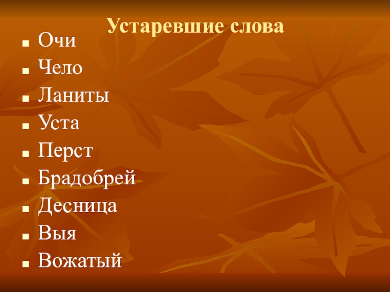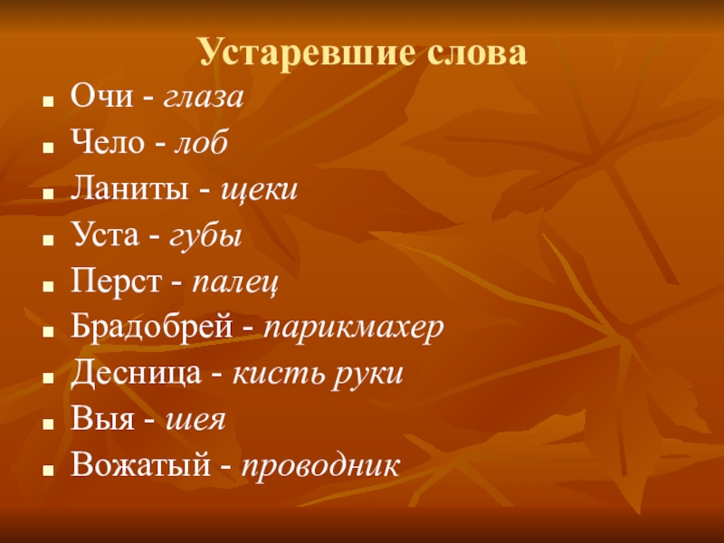 Устаревшие словаОчи Чело Ланиты Уста Перст Брадобрей Десница Выя Вожатый