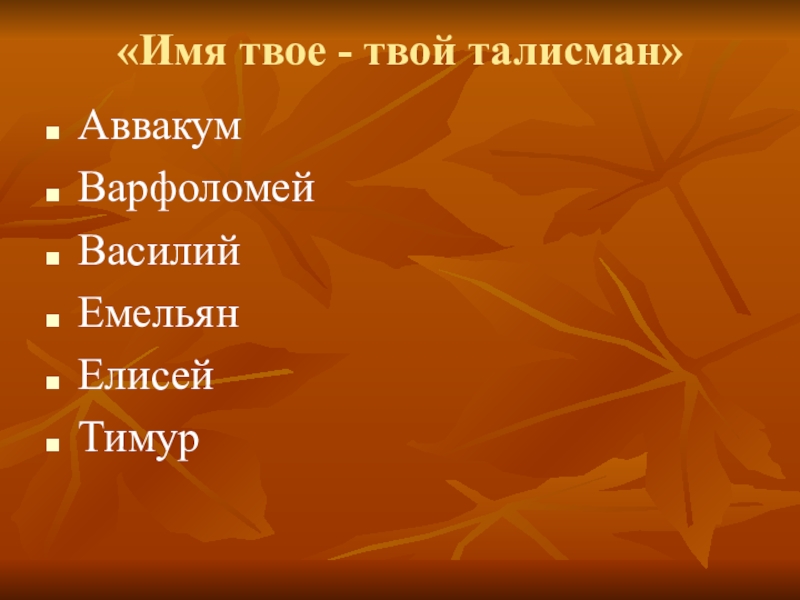 «Имя твое - твой талисман»АввакумВарфоломей Василий ЕмельянЕлисей Тимур