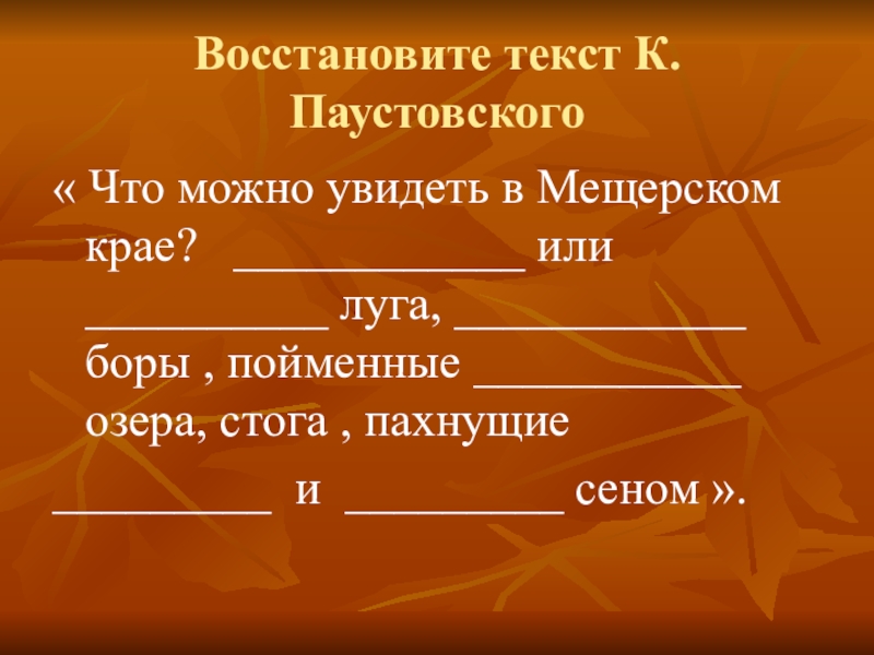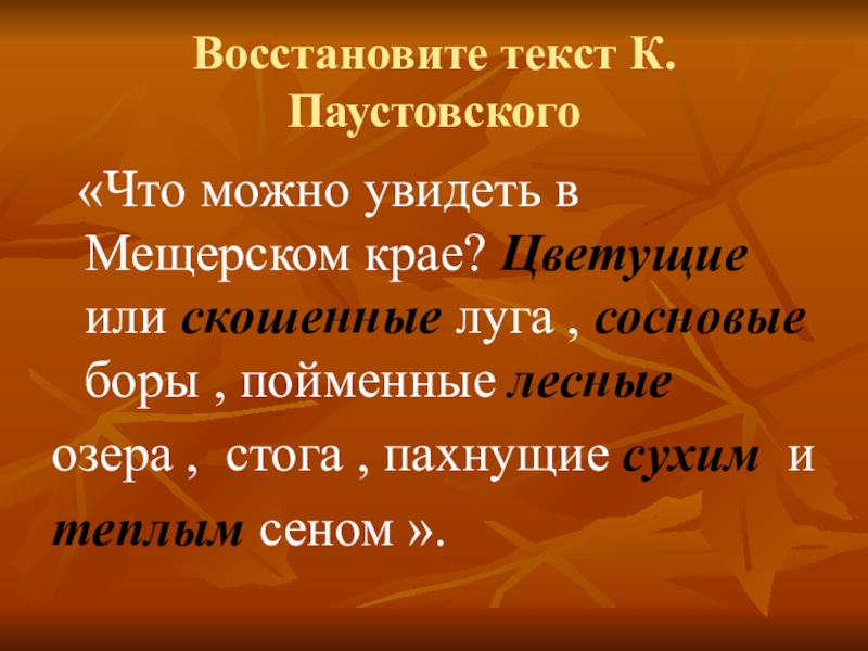 Восстановите текст К.Паустовского  «Что можно увидеть в Мещерском крае? Цветущие или скошенные луга , сосновые боры