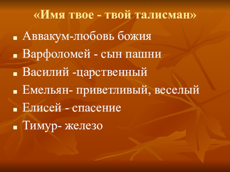 «Имя твое - твой талисман»Аввакум-любовь божияВарфоломей - сын пашниВасилий -царственныйЕмельян- приветливый, веселыйЕлисей - спасениеТимур- железо