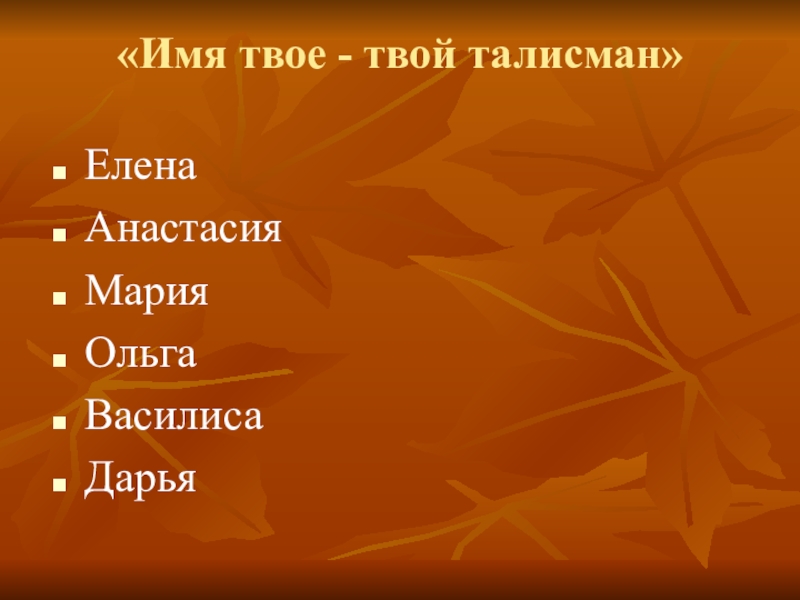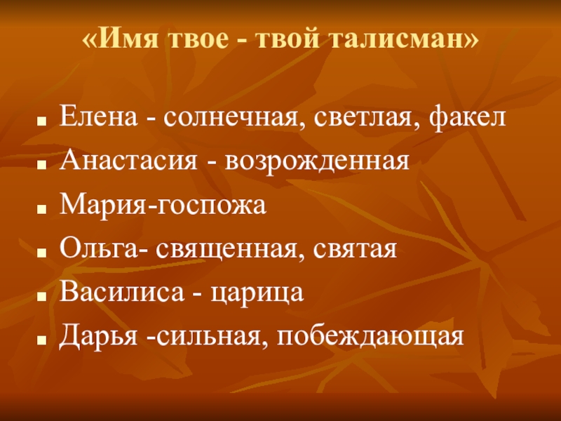 «Имя твое - твой талисман»Елена - солнечная, светлая, факелАнастасия - возрожденнаяМария-госпожаОльга- священная, святаяВасилиса - царицаДарья -сильная, побеждающая
