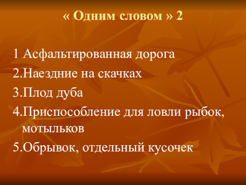 « Одним словом » 21 Асфальтированная дорога2.Наездние на скачках 3.Плод дуба 4.Приспособление для ловли рыбок, мотыльков 5.Обрывок,