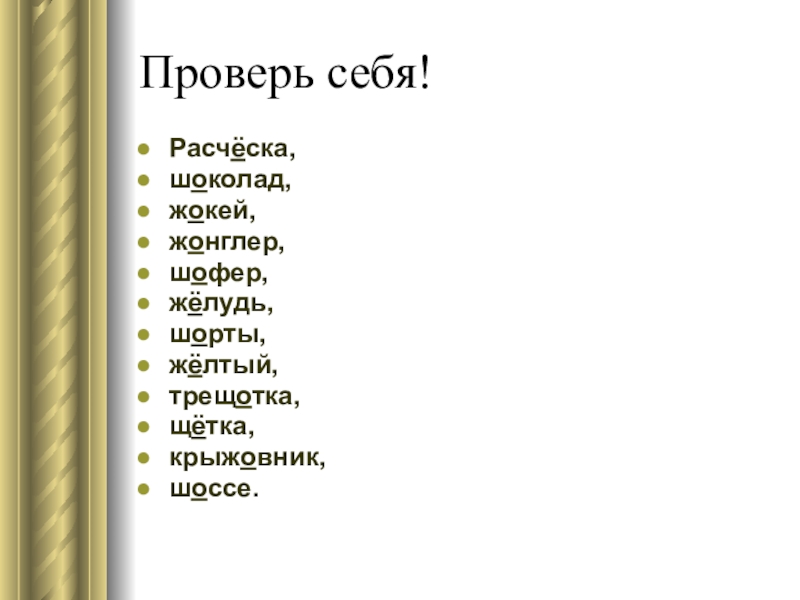 Проверь себя!Расчёска, шоколад,жокей, жонглер, шофер, жёлудь, шорты, жёлтый, трещотка, щётка, крыжовник, шоссе.