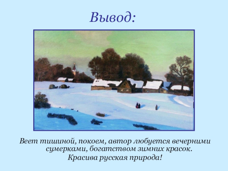 В картинах это короткое по протяженности время как бы обостряет все существо природы, мимолетными и изменчивыми становятся ее цвета, густеют тени, светлеет горизонт, солнце на снегу вспыхивает неожиданными золотистыми и охристо-лиловыми пятнами. Кажется, что еще несколько мгновений и сумерки погасят эту красивую пору дня".