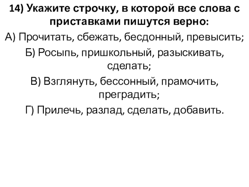 Слайд 1614) Укажите строчку, в которой все слова с приставками пишутся верно: