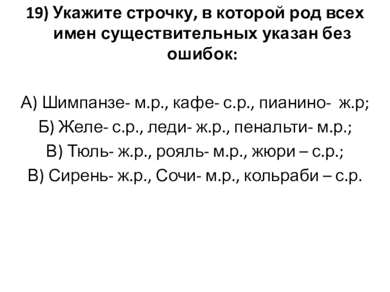 Слайд 2119) Укажите строчку, в которой род всех имен существительных указан без