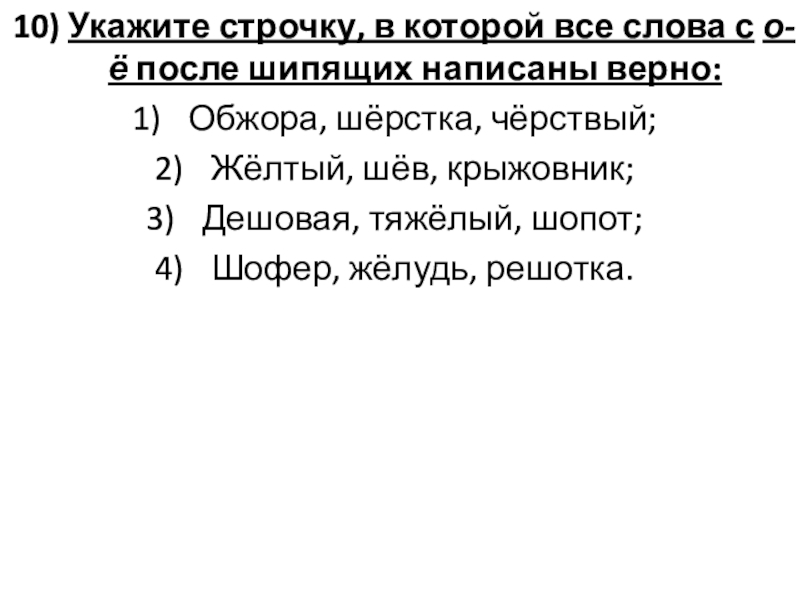Слайд 1210) Укажите строчку, в которой все слова с о-ё после шипящих