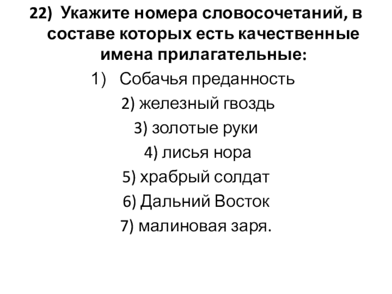 Слайд 2422) Укажите номера словосочетаний, в составе которых есть качественные имена прилагательные: