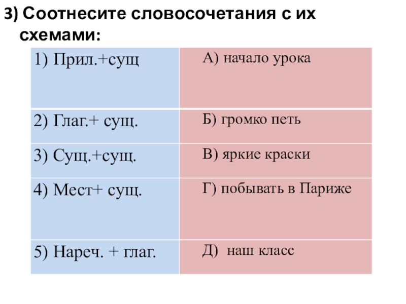 Слайд 53) Соотнесите словосочетания с их схемами: