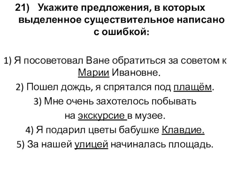 Слайд 23Укажите предложения, в которых выделенное существительное написано с ошибкой: