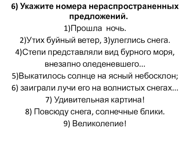 Слайд 86) Укажите номера нераспространенных предложений.