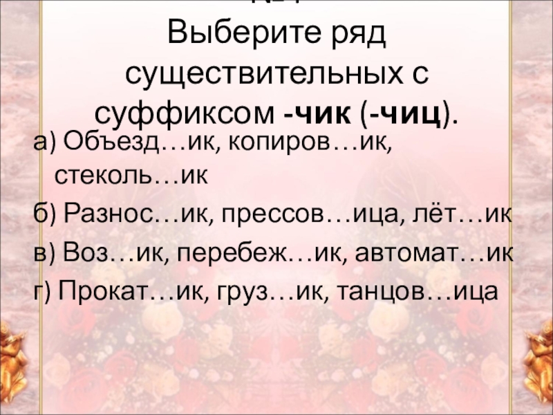 Выберите ряд существительных с суффиксом -чик (-чиц).