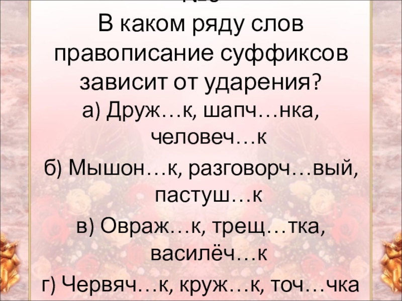 В каком ряду слов правописание суффиксов зависит от ударения?