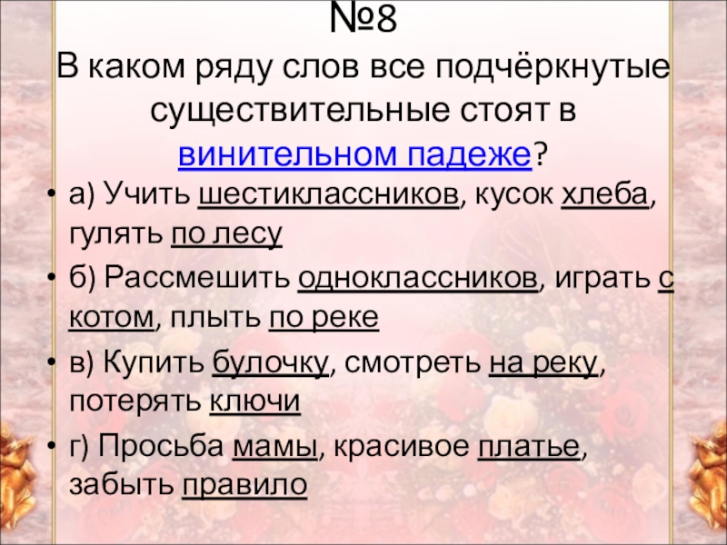 б) Рассмешить одноклассников, играть с котом, плыть по реке