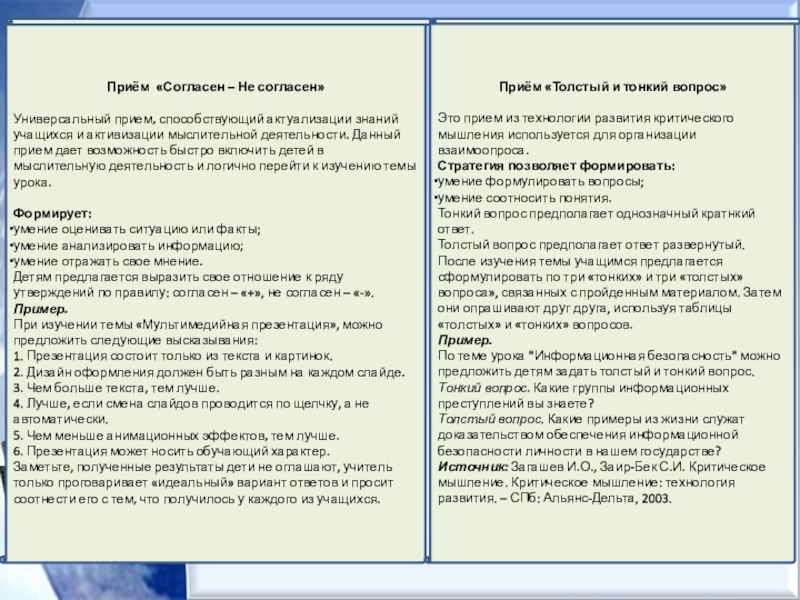 После изучения темы учащимся предлагается сформулировать по три «тонких» и три «толстых» вопроса», связанных с пройденным материалом. Затем они опрашивают друг друга, используя таблицы «толстых» и «тонких» вопросов.