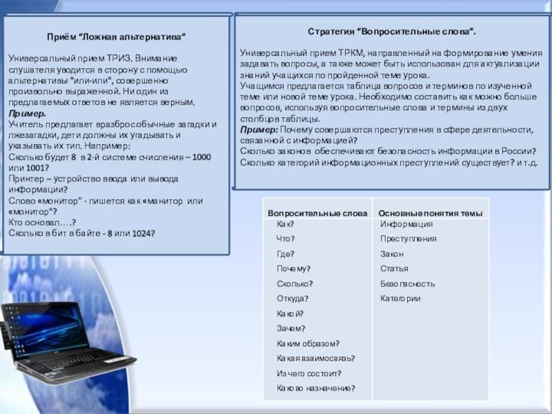 Учащимся предлагается таблица вопросов и терминов по изученной теме или новой теме урока. Необходимо составить как можно больше вопросов, используя вопросительные слова и термины из двух столбцов таблицы.