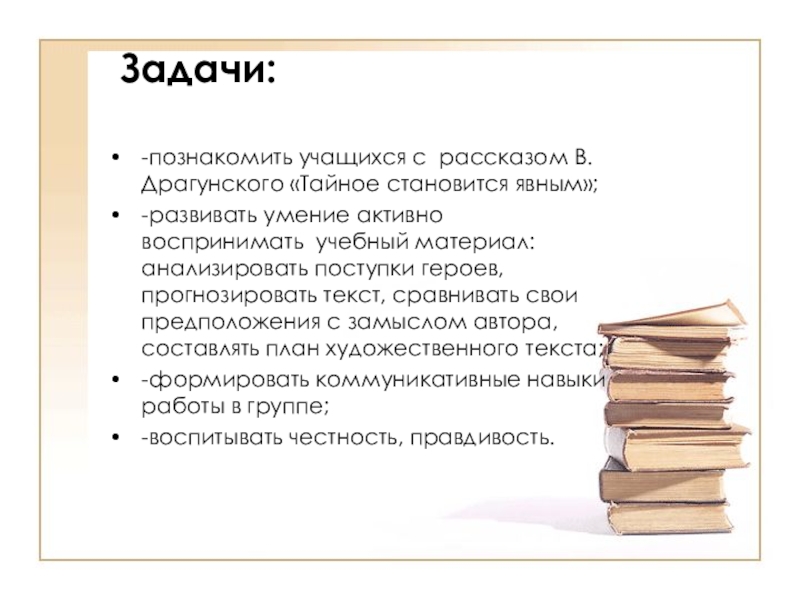 -познакомить учащихся с рассказом В. Драгунского «Тайное становится явным»;