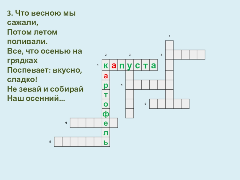 3. Что весною мы сажали, Потом летом поливали. Все, что осенью на грядках Поспевает: вкусно, сладко! Не