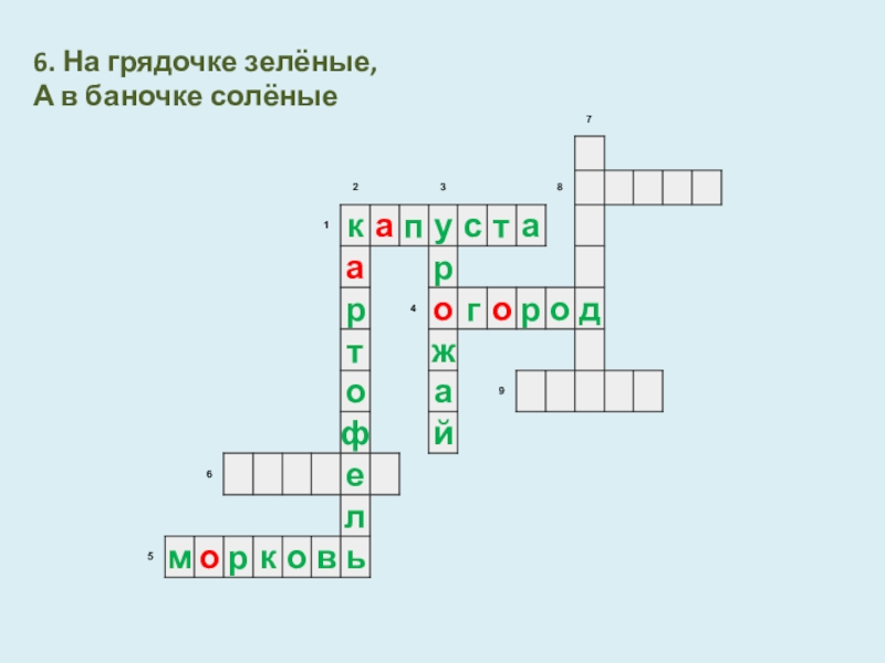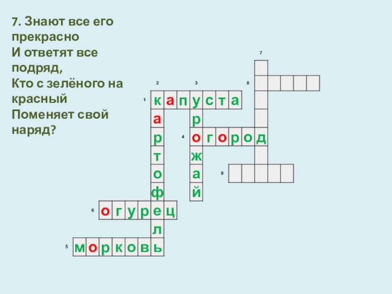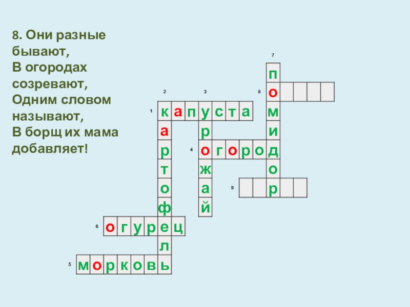8. Они разные бывают,В огородах созревают,Одним словом называют,В борщ их мама добавляет!