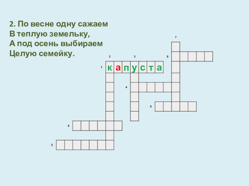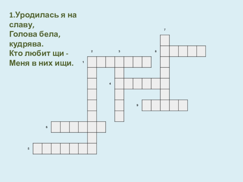1.Уродилась я на славу, Голова бела, кудрява. Кто любит щи - Меня в них ищи.