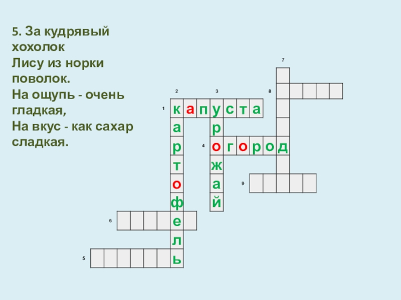 5. За кудрявый хохолок Лису из норки поволок. На ощупь - очень гладкая, На вкус - как