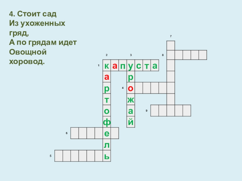 4. Стоит садИз ухоженных гряд,А по грядам идетОвощной хоровод.
