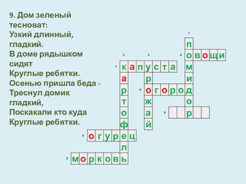 9. Дом зеленый тесноват: Узкий длинный, гладкий. В доме рядышком сидят Круглые ребятки. Осенью пришла беда -