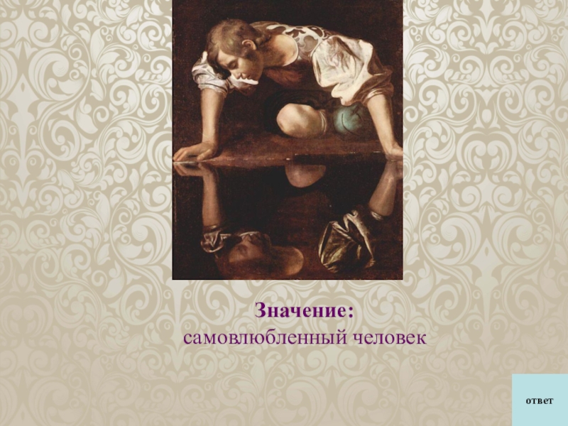 никого не любивший, наклонился над ручьем и, увидев в нем свое лицо, влюбился в самого себя и умер от тоски; тело его обратилось в цветок.