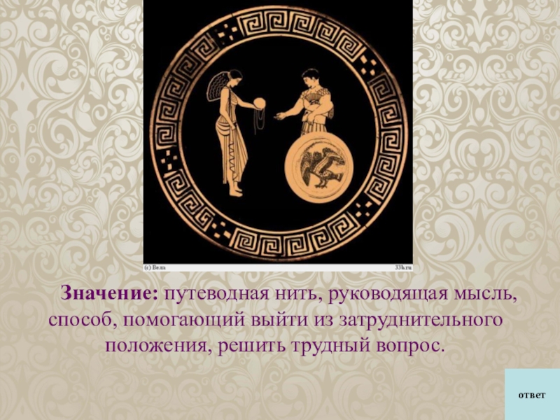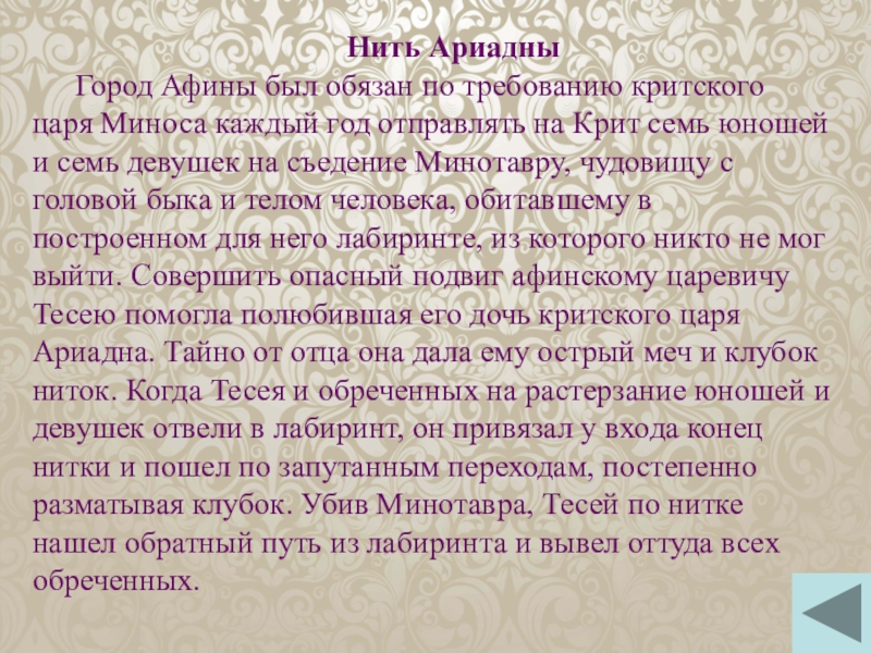 год отправлять на Крит семь юношей и семь девушек на съедение Минотавру, чудовищу с головой быка и телом человека, обитавшему в построенном для него лабиринте, из которого никто не мог выйти. Совершить опасный подвиг афинскому царевичу Тесею помогла полюбившая его дочь критского царя Ариадна. Тайно от отца она дала ему острый меч и клубок ниток. Когда Тесея и обреченных на растерзание юношей и девушек отвели в лабиринт, он привязал у входа конец нитки и пошел по запутанным переходам, постепенно разматывая клубок. Убив Минотавра, Тесей по нитке нашел обратный путь из лабиринта и вывел оттуда всех обреченных.