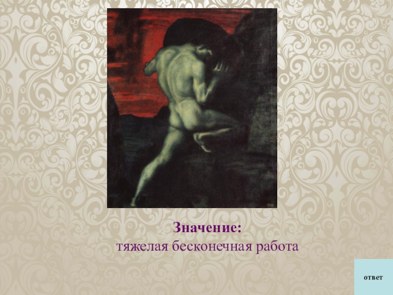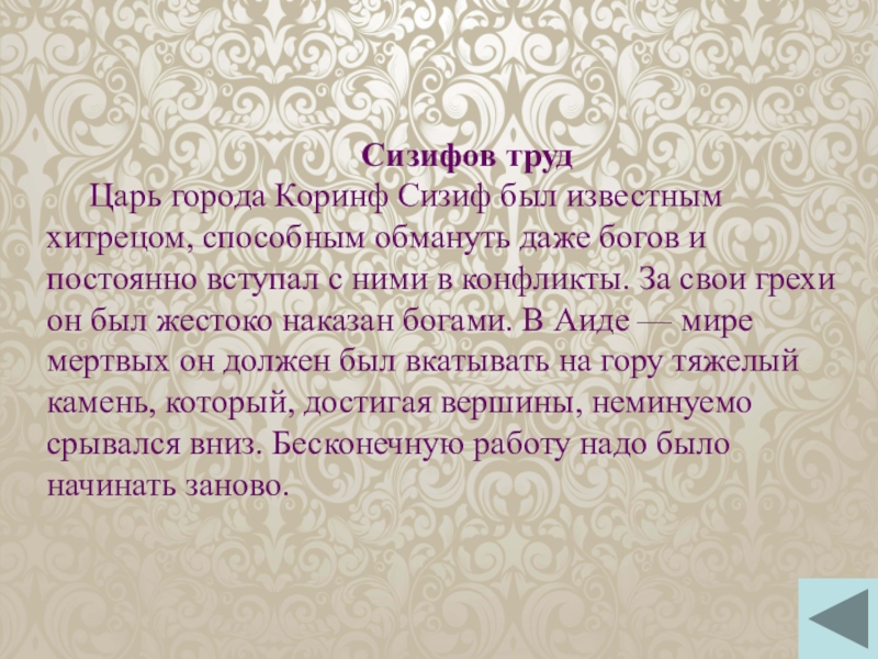 богов и постоянно вступал с ними в конфликты. За свои грехи он был жестоко наказан богами. В Аиде — мире мертвых он должен был вкатывать на гору тяжелый камень, который, достигая вершины, неминуемо срывался вниз. Бесконечную работу надо было начинать заново.