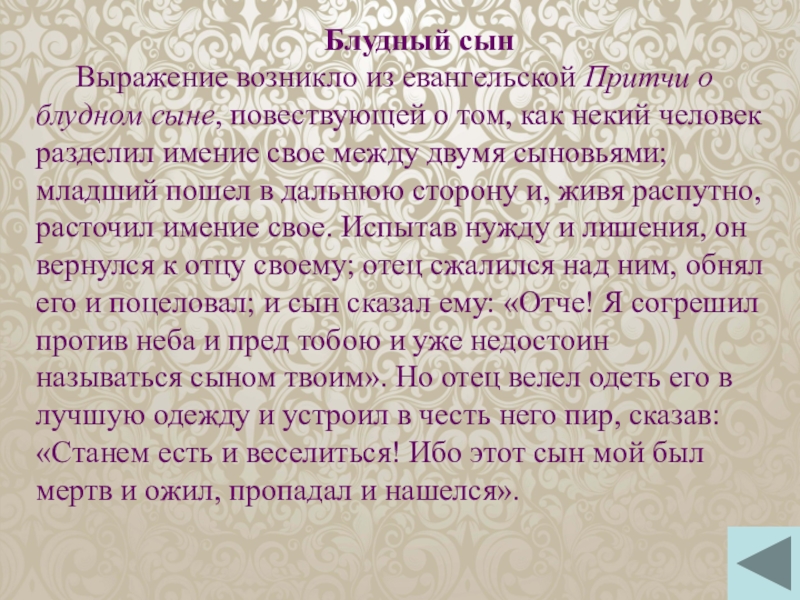 Выражение возникло из евангельской Притчи о блудном сыне, повествующей о