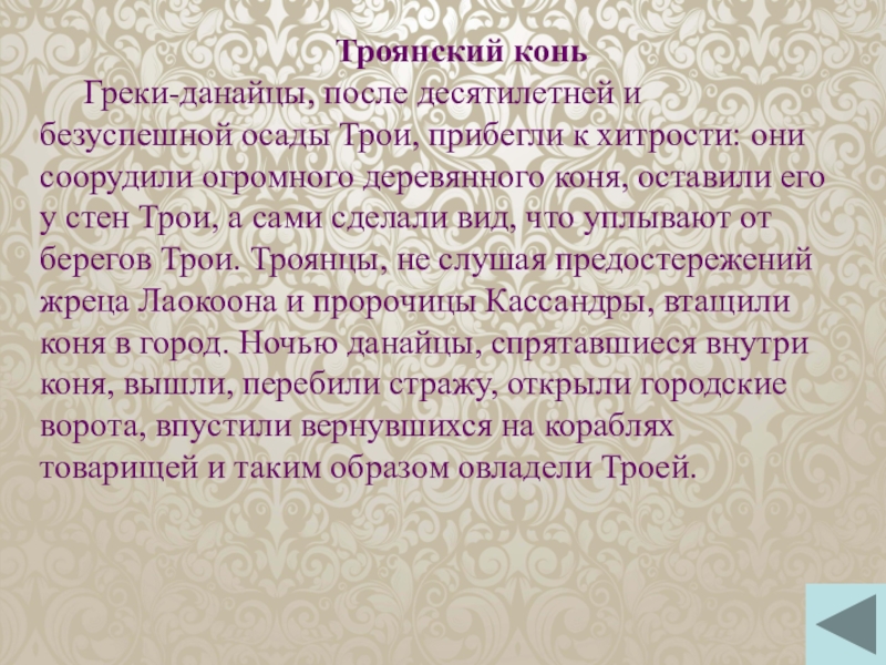 Греки-данайцы, после десятилетней и безуспешной осады Трои, прибегли к хитрости: