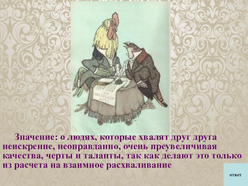 Значение: о людях, которые хвалят друг друга неискренне, неоправданно, очень преувеличивая