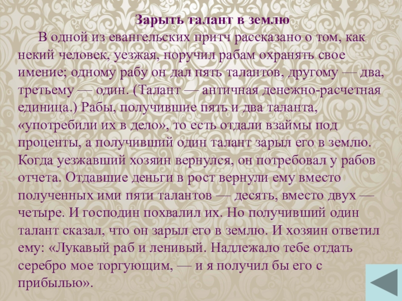как некий человек, уезжая, поручил рабам охранять свое имение; одному рабу он дал пять талантов, другому — два, третьему — один. (Талант — античная денежно-расчетная единица.) Рабы, получившие пять и два таланта, «употребили их в дело», то есть отдали взаймы под проценты, а получивший один талант зарыл его в землю. Когда уезжавший хозяин вернулся, он потребовал у рабов отчета. Отдавшие деньги в рост вернули ему вместо полученных ими пяти талантов — десять, вместо двух — четыре. И господин похвалил их. Но получивший один талант сказал, что он зарыл его в землю. И хозяин ответил ему: «Лукавый раб и ленивый. Надлежало тебе отдать серебро мое торгующим, — и я получил бы его с прибылью».