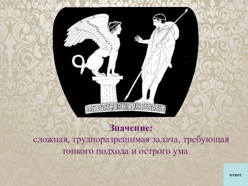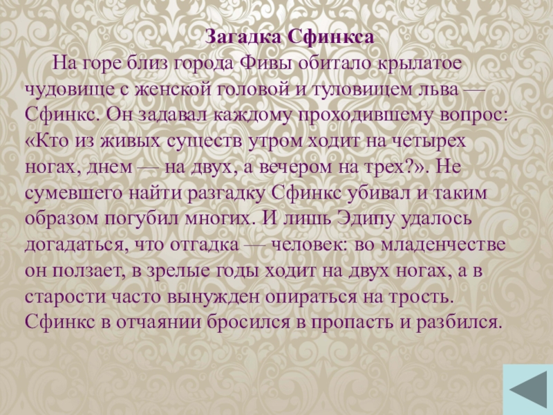 головой и туловищем льва — Сфинкс. Он задавал каждому проходившему вопрос: «Кто из живых существ утром ходит на четырех ногах, днем — на двух, а вечером на трех?». Не сумевшего найти разгадку Сфинкс убивал и таким образом погубил многих. И лишь Эдипу удалось догадаться, что отгадка — человек: во младенчестве он ползает, в зрелые годы ходит на двух ногах, а в старости часто вынужден опираться на трость. Сфинкс в отчаянии бросился в пропасть и разбился.