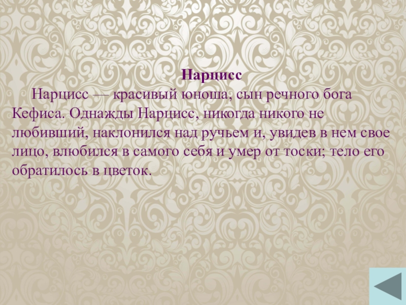 Нарцисс — красивый юноша, сын речного бога Кефиса. Однажды Нарцисс, никогда