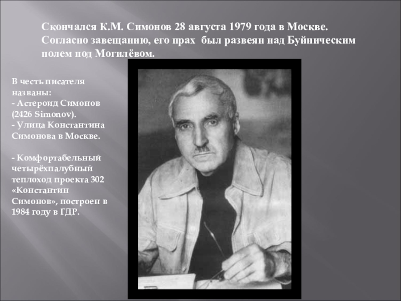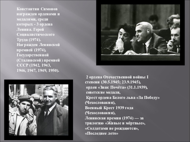 Ленинская премия (1974) — за трилогию «Живые и мёртвые», «Солдатами не рождаются», «Последнее лето»